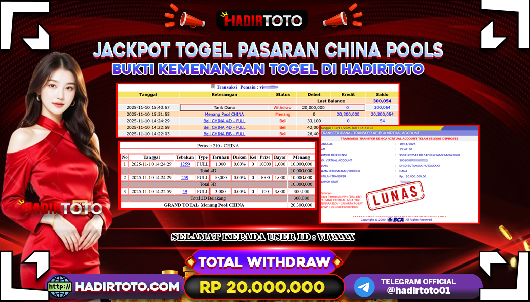 ꧁༒☬👑HADIRTOTO👑☬༒꧂ Jackpot 🐋 TOGEL CHINA POOLS ~ RP.20.000.000.,- LUNAS