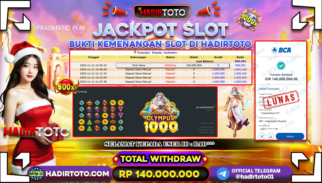Selamat Kepada Member 𓆩♕𓆪 HADIRTOTO 𓆩♕𓆪 Yang Telah Berhasil Meraih Kemenangan dengan ID : BAD*** di permainan SLOT Gates Of Olympus dengan kemenengan sebesar Rp.140.000.000 , Setelah mengisi formulir withdraw dengan kurung waktu hanya 5 – 10 menit pihak hadirtoto sudah melakukan transfer kepada pemilik Userid dan dana sudah dapat di cairkan oleh pemenang. Bukti pembayaran yang kami berikan merupakan bukti pembayaran yang SAH / VALID yang langung di dapatkan melalui tanda transfer transaksi dari Bank yang di tuju. Kami mengucapakan banyak Terima Kasih Kepada pemenang karena sudah mempercayakan kami sebagai Bandar Tepercaya yang membayar semua kemenangan member hingga lunas. Masih ragu dengan hadirtoto kak ? Di mana bandar togel online sekarang yang terpercaya seperti hadirtoto? Bandar yang mengirimkan kemenangan member tanpa bertele – tele. Jadi…. tidak perlu khawatir pada situs hadirtoto karena kemenangan anda berapapun akan dibayarakan hingga lunas kepada pemenang.