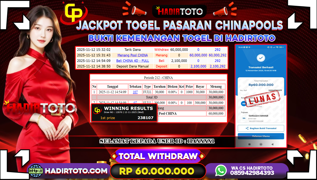 ꧁༒☬👑HADIRTOTO👑☬༒꧂ Jackpot 🐋 TOGEL CHINA POOLS ~ RP.60.000.000.,- LUNAS