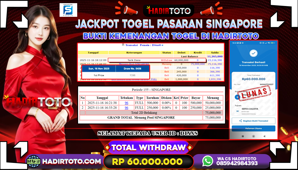 ꧁༒☬👑HADIRTOTO👑☬༒꧂ Jackpot 🐋 TOGEL PASARAN SINGAPORE POOLS ~ RP.60.000.000.,- LUNAS