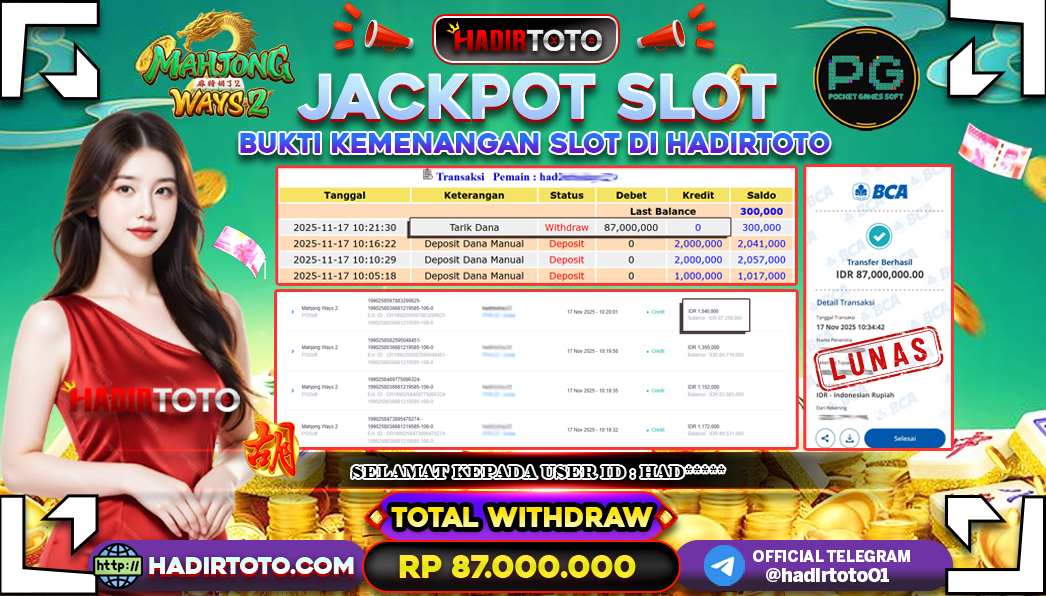 Selamat Kepada Member 𓆩♕𓆪 HADIRTOTO 𓆩♕𓆪 Yang Telah Berhasil Meraih Kemenangan dengan ID : HAD**** di permainan SLOT MAHJONG WAYS 2 dengan kemenengan sebesar Rp.87.000.000 , Setelah mengisi formulir withdraw dengan kurung waktu hanya 5 – 10 menit pihak hadirtoto sudah melakukan transfer kepada pemilik Userid dan dana sudah dapat di cairkan oleh pemenang. Bukti pembayaran yang kami berikan merupakan bukti pembayaran yang SAH / VALID yang langung di dapatkan melalui tanda transfer transaksi dari Bank yang di tuju. Kami mengucapakan banyak Terima Kasih Kepada pemenang karena sudah mempercayakan kami sebagai Bandar Tepercaya yang membayar semua kemenangan member hingga lunas. Masih ragu dengan hadirtoto kak ? Di mana bandar togel online sekarang yang terpercaya seperti hadirtoto? Bandar yang mengirimkan kemenangan member tanpa bertele – tele. Jadi…. tidak perlu khawatir pada situs hadirtoto karena kemenangan anda berapapun akan dibayarakan hingga lunas kepada pemenang.
