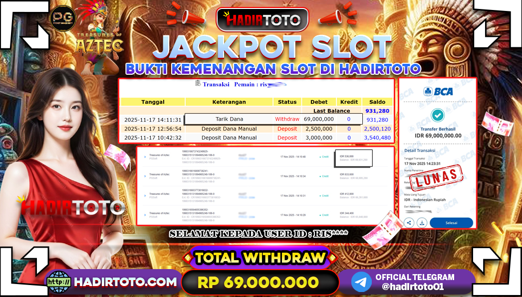 Selamat Kepada Member 𓆩♕𓆪 HADIRTOTO 𓆩♕𓆪 Yang Telah Berhasil Meraih Kemenangan dengan ID : RIS*** di permainan SLOT TREASURES OF AZTEC dengan kemenengan sebesar Rp.69.000.000 , Setelah mengisi formulir withdraw dengan kurung waktu hanya 5 – 10 menit pihak hadirtoto sudah melakukan transfer kepada pemilik Userid dan dana sudah dapat di cairkan oleh pemenang. Bukti pembayaran yang kami berikan merupakan bukti pembayaran yang SAH / VALID yang langung di dapatkan melalui tanda transfer transaksi dari Bank yang di tuju. Kami mengucapakan banyak Terima Kasih Kepada pemenang karena sudah mempercayakan kami sebagai Bandar Tepercaya yang membayar semua kemenangan member hingga lunas. Masih ragu dengan hadirtoto kak ? Di mana bandar togel online sekarang yang terpercaya seperti hadirtoto? Bandar yang mengirimkan kemenangan member tanpa bertele – tele. Jadi…. tidak perlu khawatir pada situs hadirtoto karena kemenangan anda berapapun akan dibayarakan hingga lunas kepada pemenang.