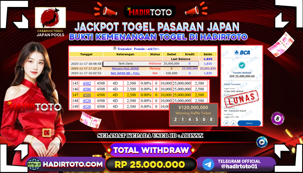 Selamat Kepada Member 𓆩♕𓆪 HADIRTOTO 𓆩♕𓆪 Yang Telah Berhasil Meraih Kemenangan dengan ID : ARI*** di permainan TOGEL Pasaran JAPAN POOLS dengan kemenangan sebesar Rp.25.000.000 , Setelah mengisi formulir withdraw dengan kurung waktu hanya 5 – 10 menit pihak hadirtoto sudah melakukan transfer kepada pemilik Userid dan dana sudah dapat di cairkan oleh pemenang. Bukti pembayaran yang kami berikan merupakan bukti pembayaran yang SAH / VALID yang langung di dapatkan melalui tanda transfer transaksi dari Bank yang di tuju. Kami mengucapakan banyak Terima Kasih Kepada pemenang karena sudah mempercayakan kami sebagai Bandar Tepercaya yang membayar semua kemenangan member hingga lunas. Masih ragu dengan hadirtoto kak ? Di mana bandar togel online sekarang yang terpercaya seperti hadirtoto? Bandar yang mengirimkan kemenangan member tanpa bertele – tele. Jadi…. tidak perlu khawatir pada situs hadirtoto karena kemenangan anda berapapun akan dibayarakan hingga lunas kepada pemenang.